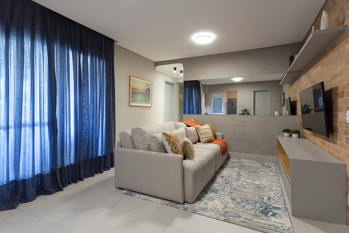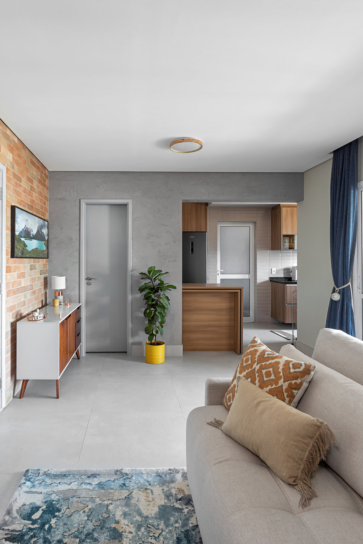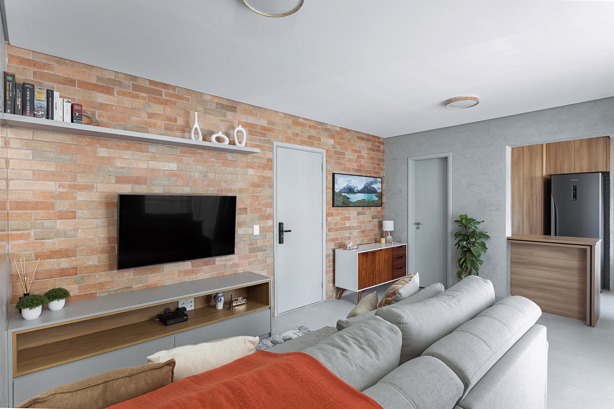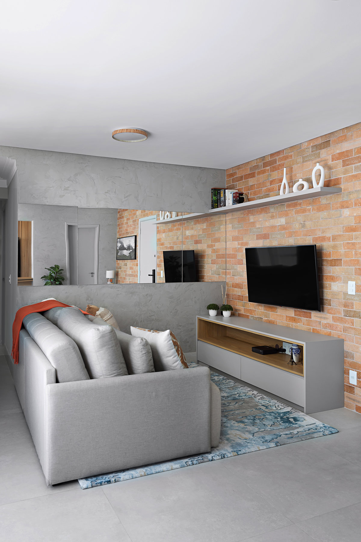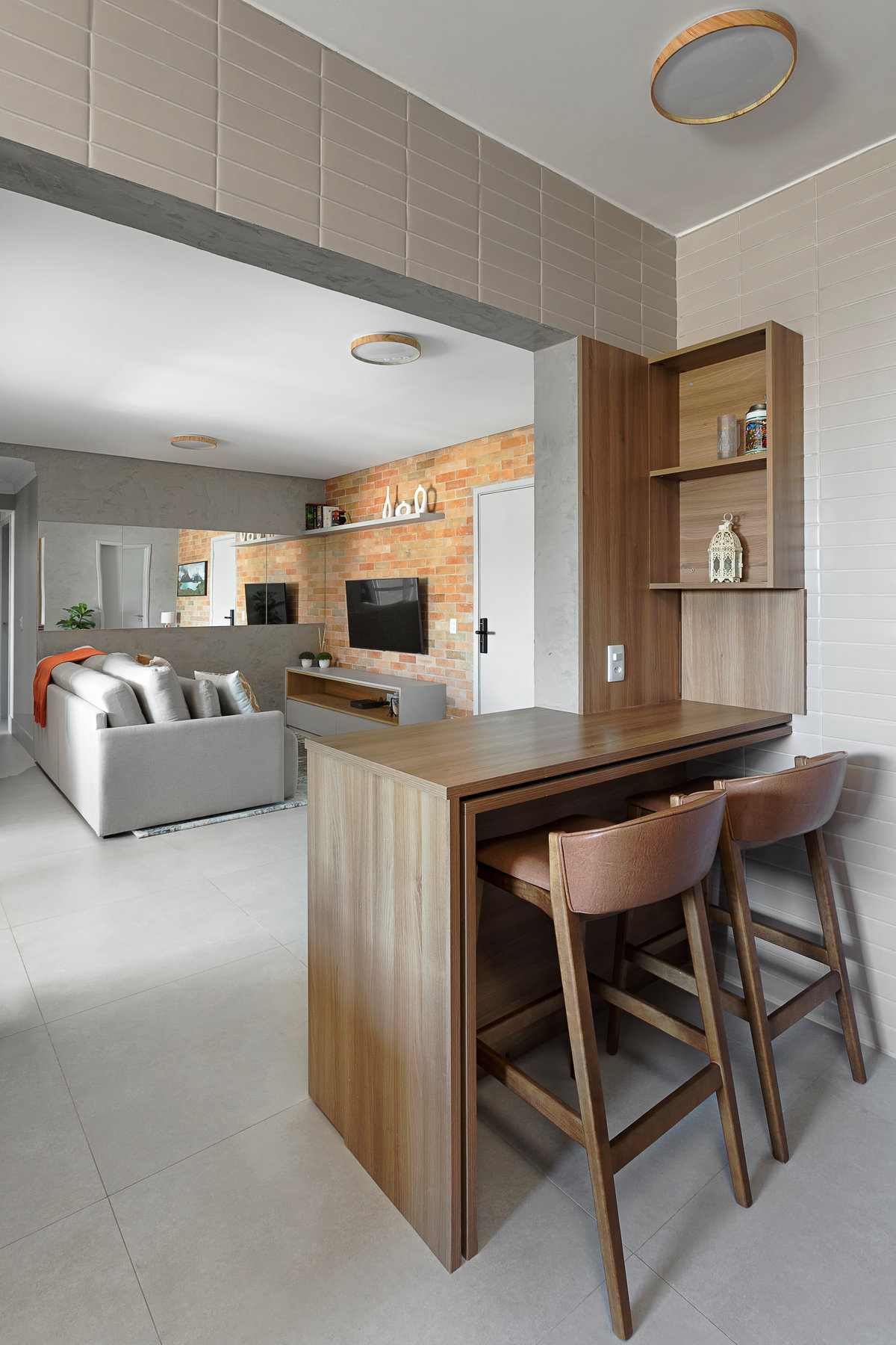 O Apartamento de 90m² em Alphaville, chamado de Apartamento LB, foi transformado para atender às necessidades de um novo casal, otimizando tempo e custo ao aproveitar elementos existentes. A parede de tijolinhos na sala adicionou autenticidade e atendeu ao desejo dos clientes.