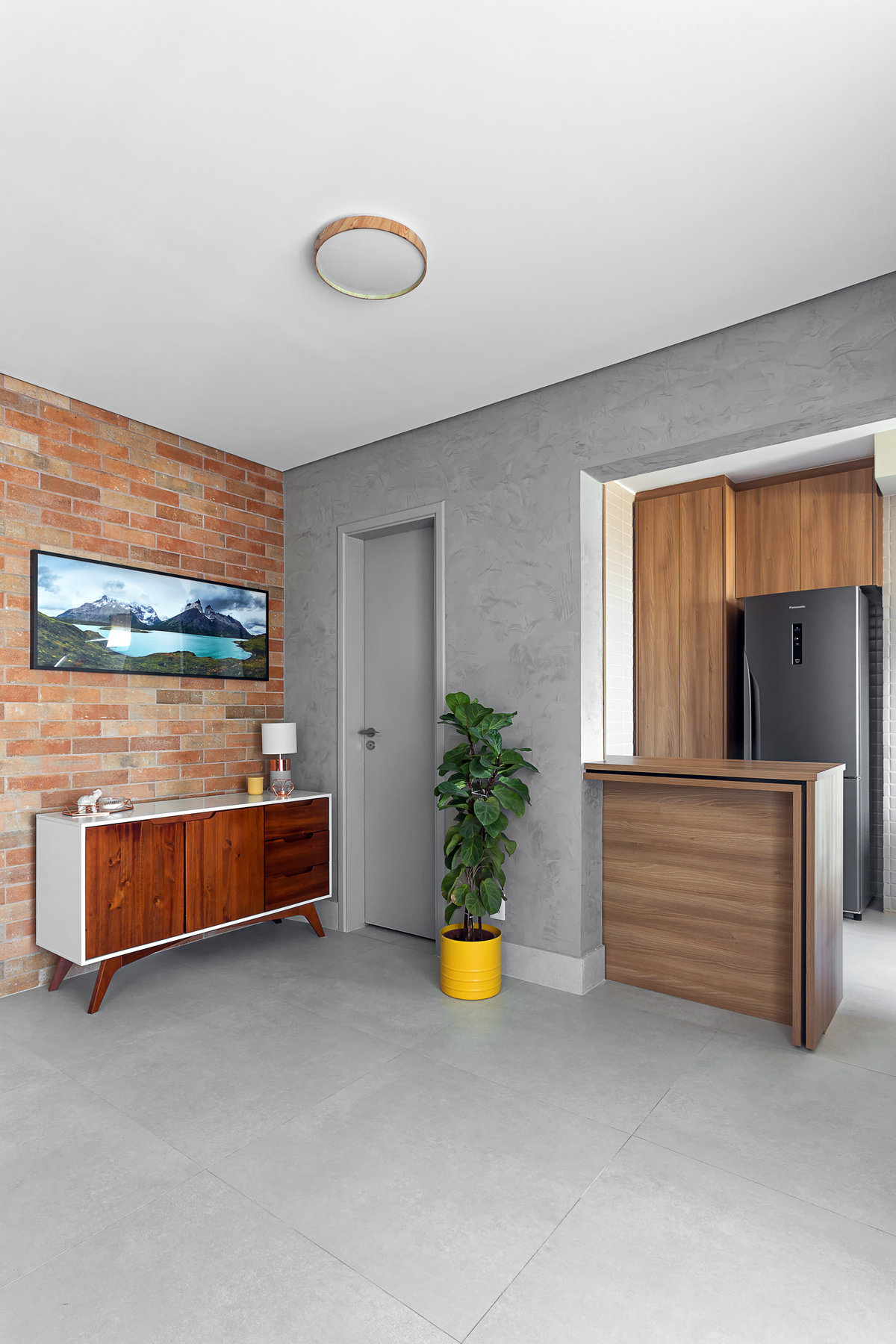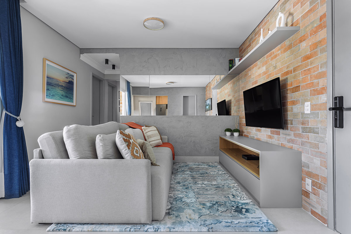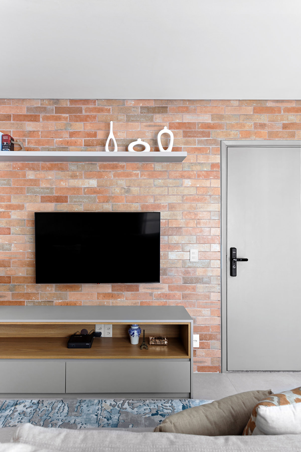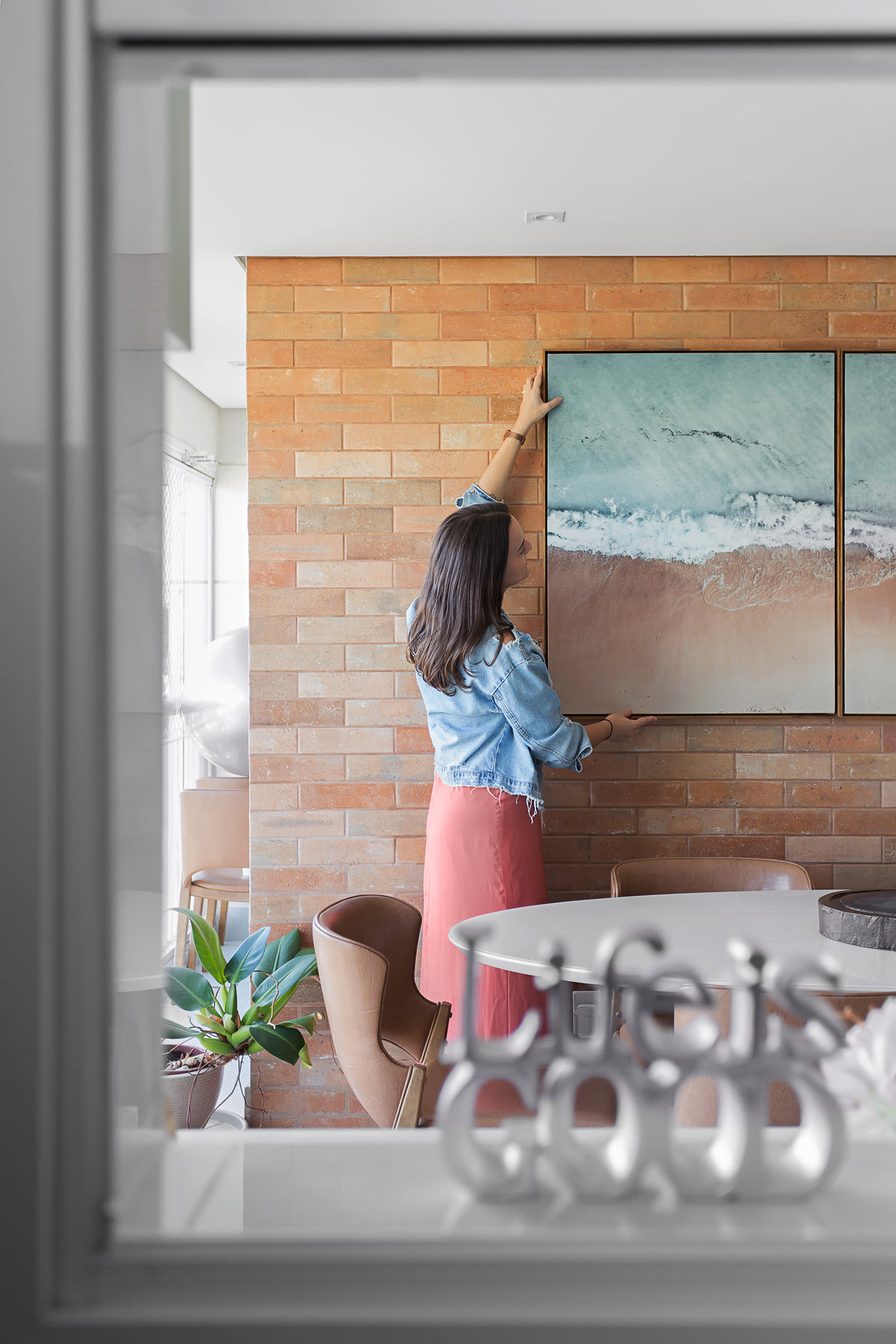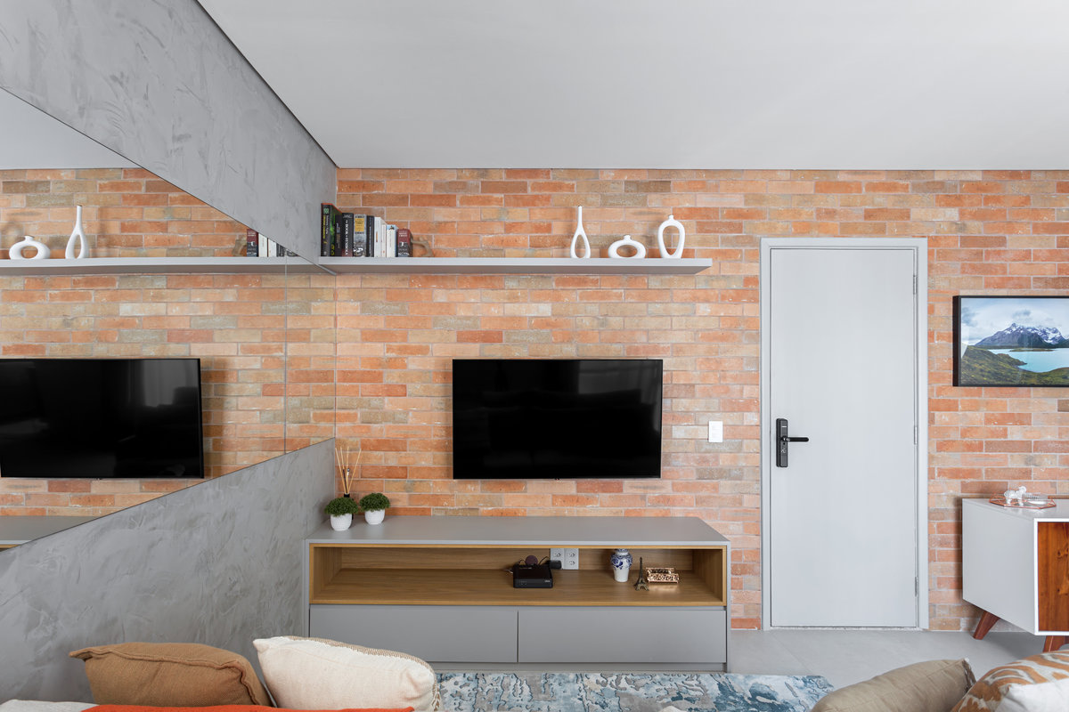 O Apartamento de 90m² em Alphaville, chamado de Apartamento LB, foi transformado para atender às necessidades de um novo casal, otimizando tempo e custo ao aproveitar elementos existentes. A parede de tijolinhos na sala adicionou autenticidade e atendeu ao desejo dos clientes.