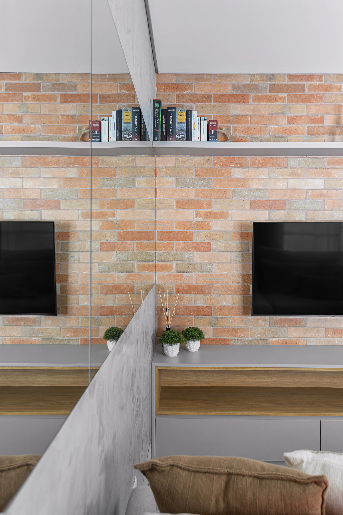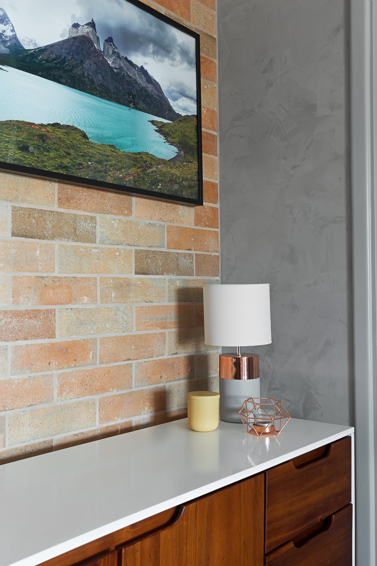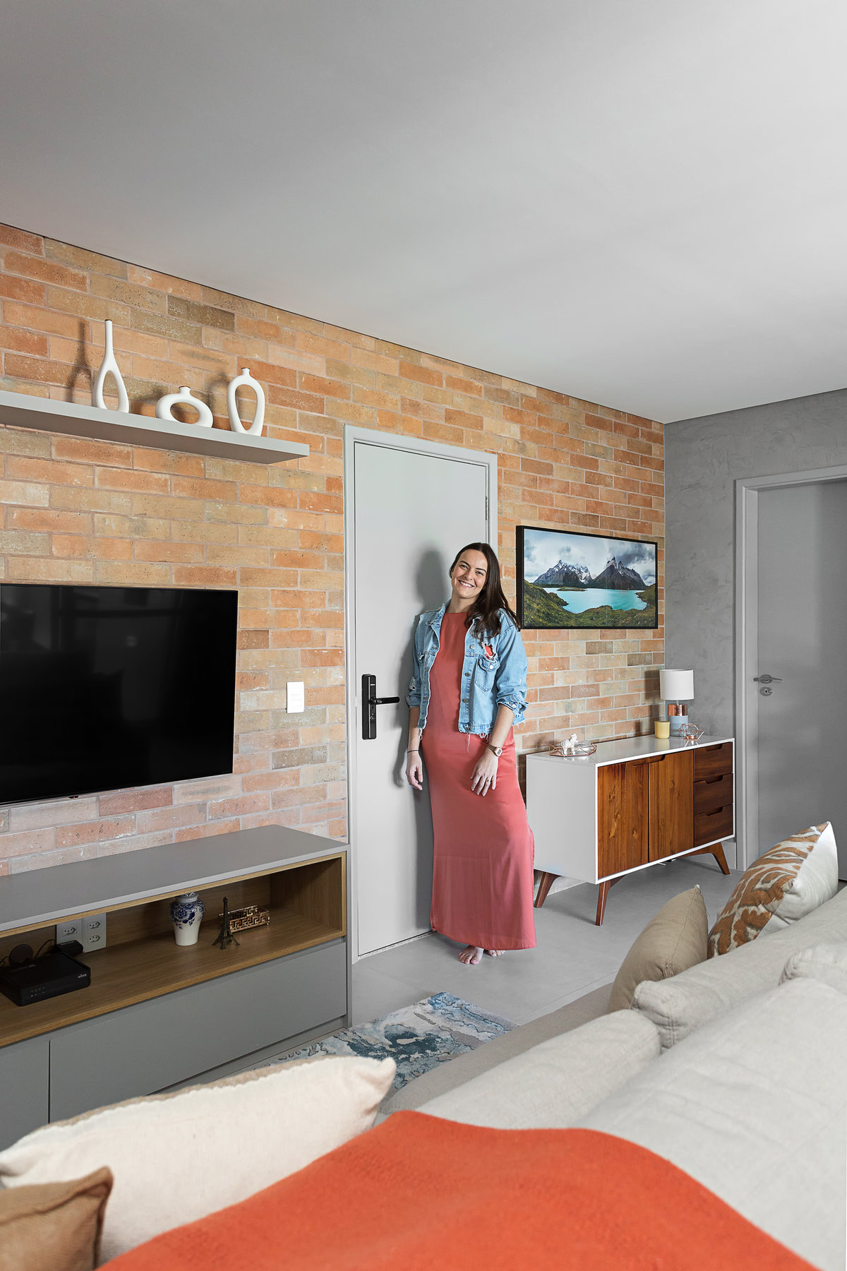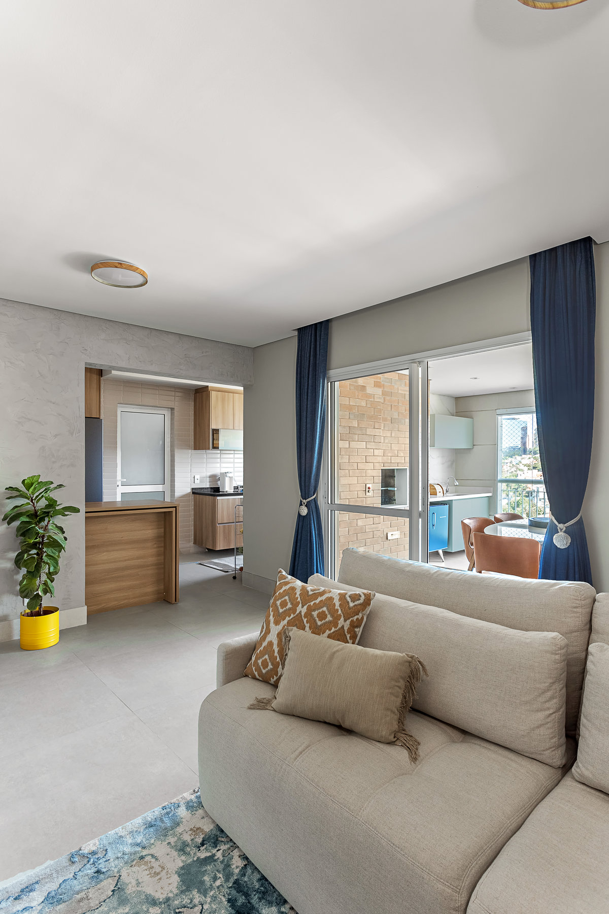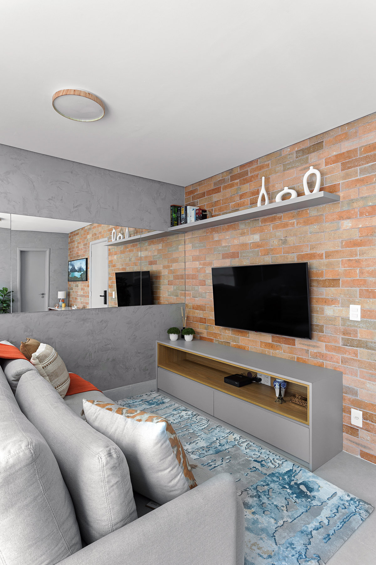 O Apartamento de 90m² em Alphaville, chamado de Apartamento LB, foi transformado para atender às necessidades de um novo casal, otimizando tempo e custo ao aproveitar elementos existentes. A parede de tijolinhos na sala adicionou autenticidade e atendeu ao desejo dos clientes.