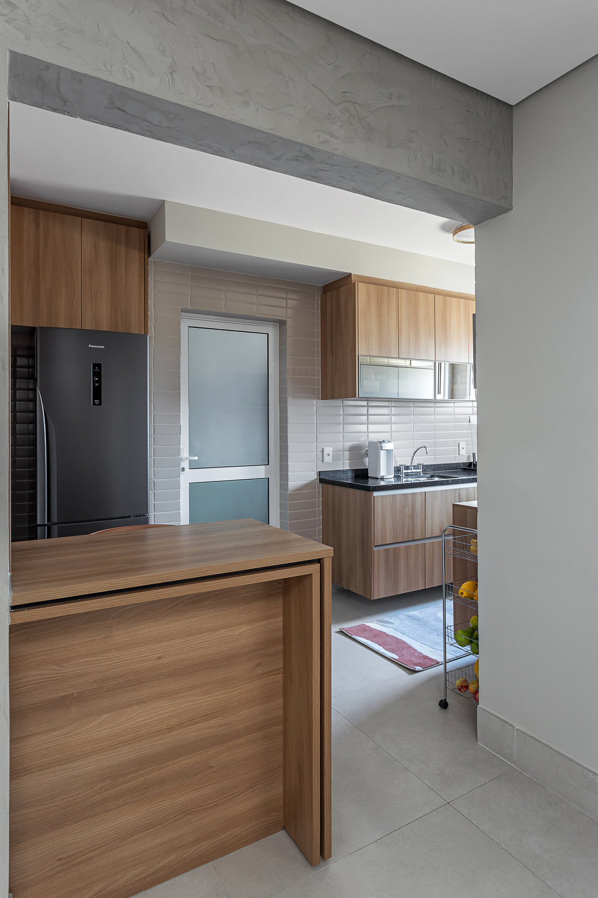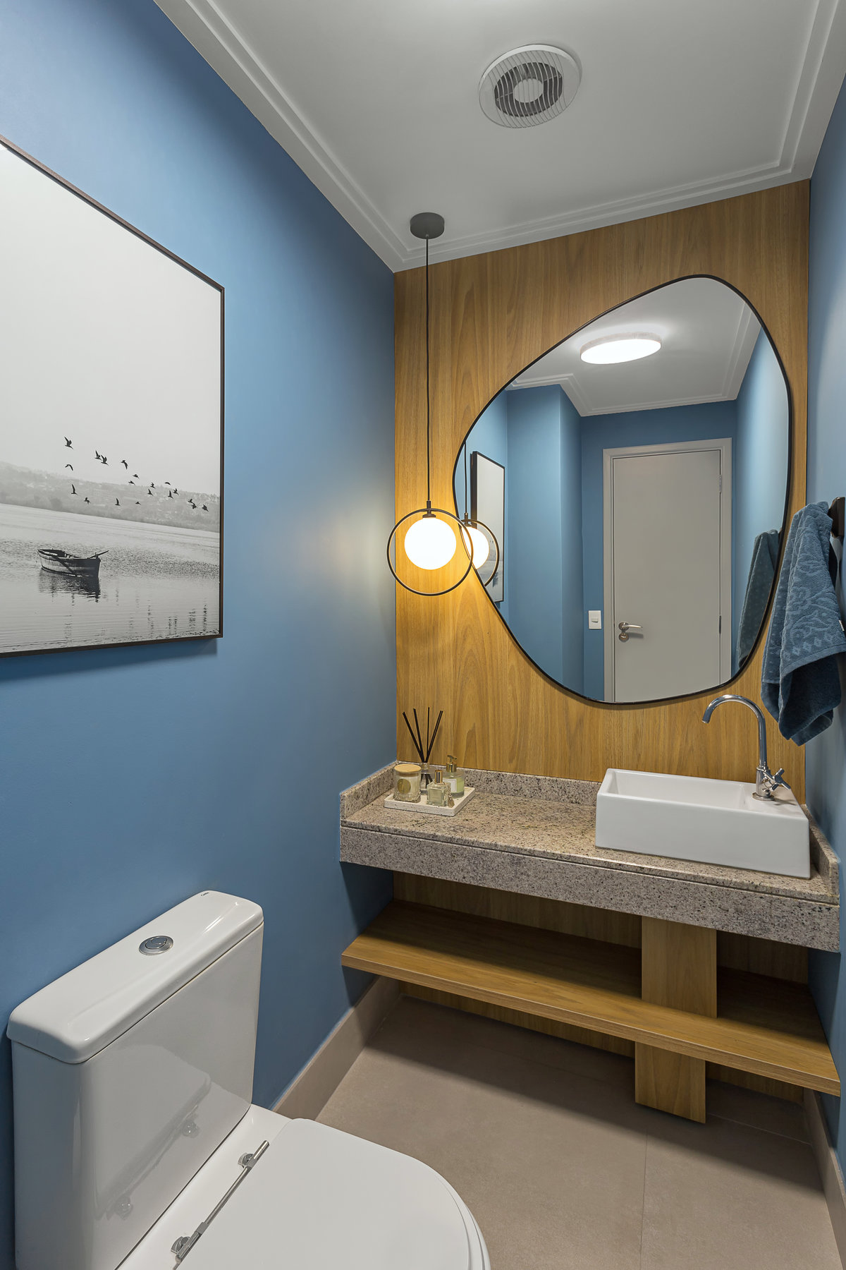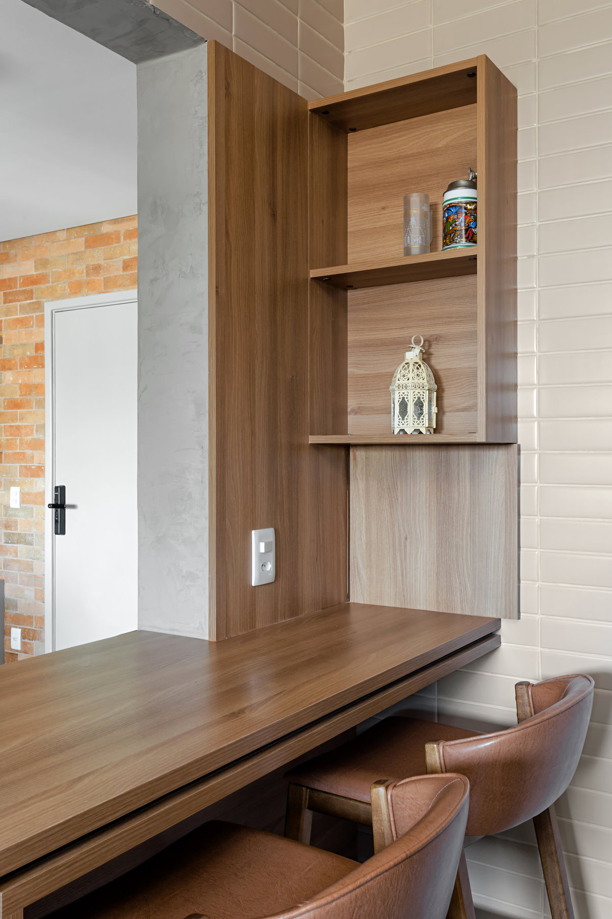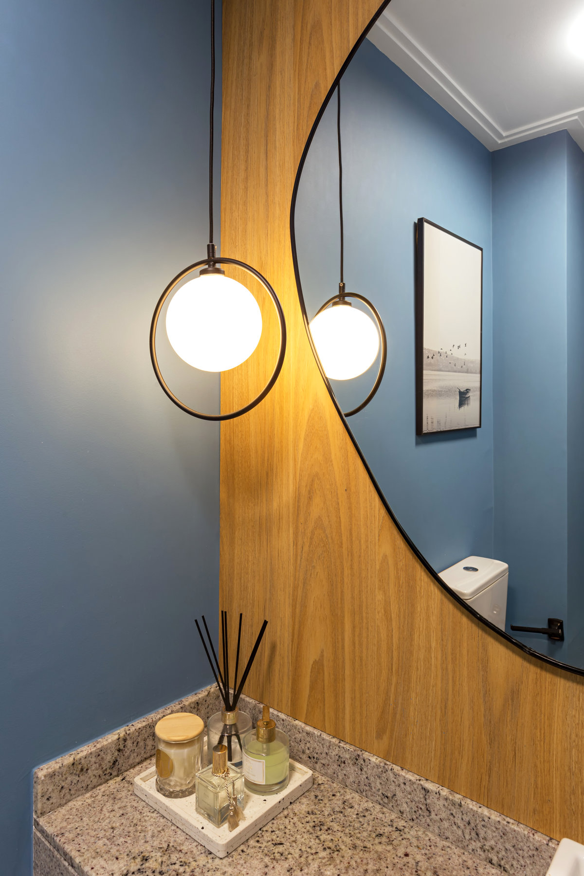O lavabo ganhou cor nas paredes, um novo espelho orgânico, iluminação decorativa e toques de madeira, mantendo a bancada original. A cozinha foi renovada com novos revestimentos, iluminação e um armário para o micro-ondas. A varanda gourmet também recebeu tijolinhos e uma mesa oval para melhor acomodar visitas. A antiga sala de TV foi convertida em um versátil quarto de hóspedes e home office, graças à construção de uma parede de drywall.
