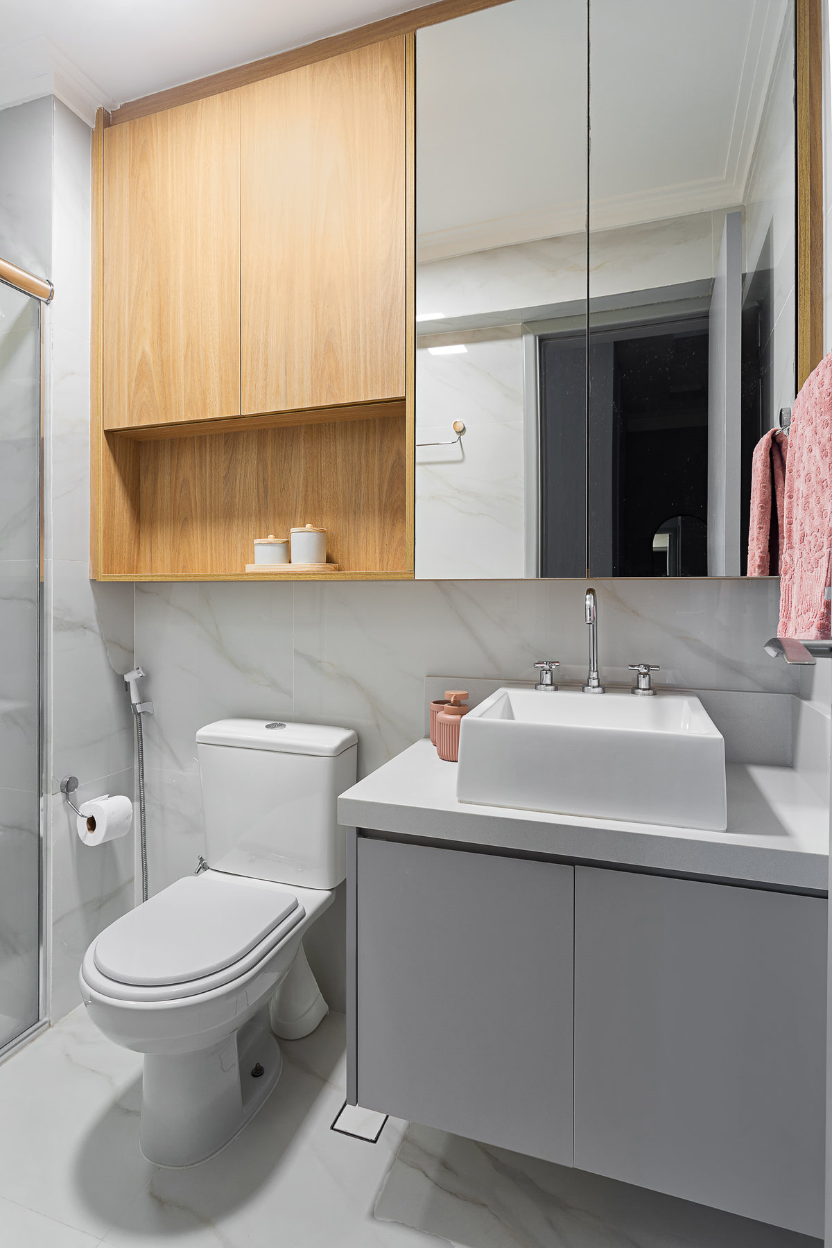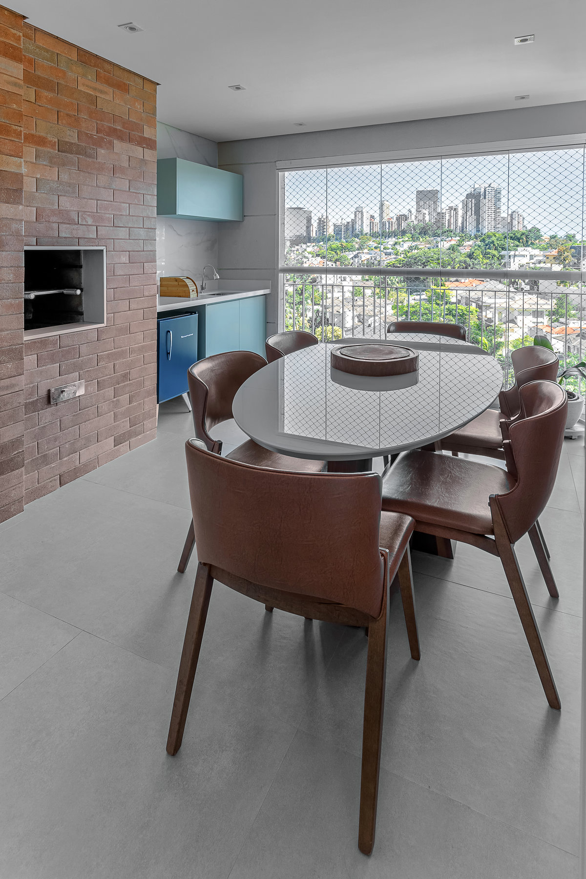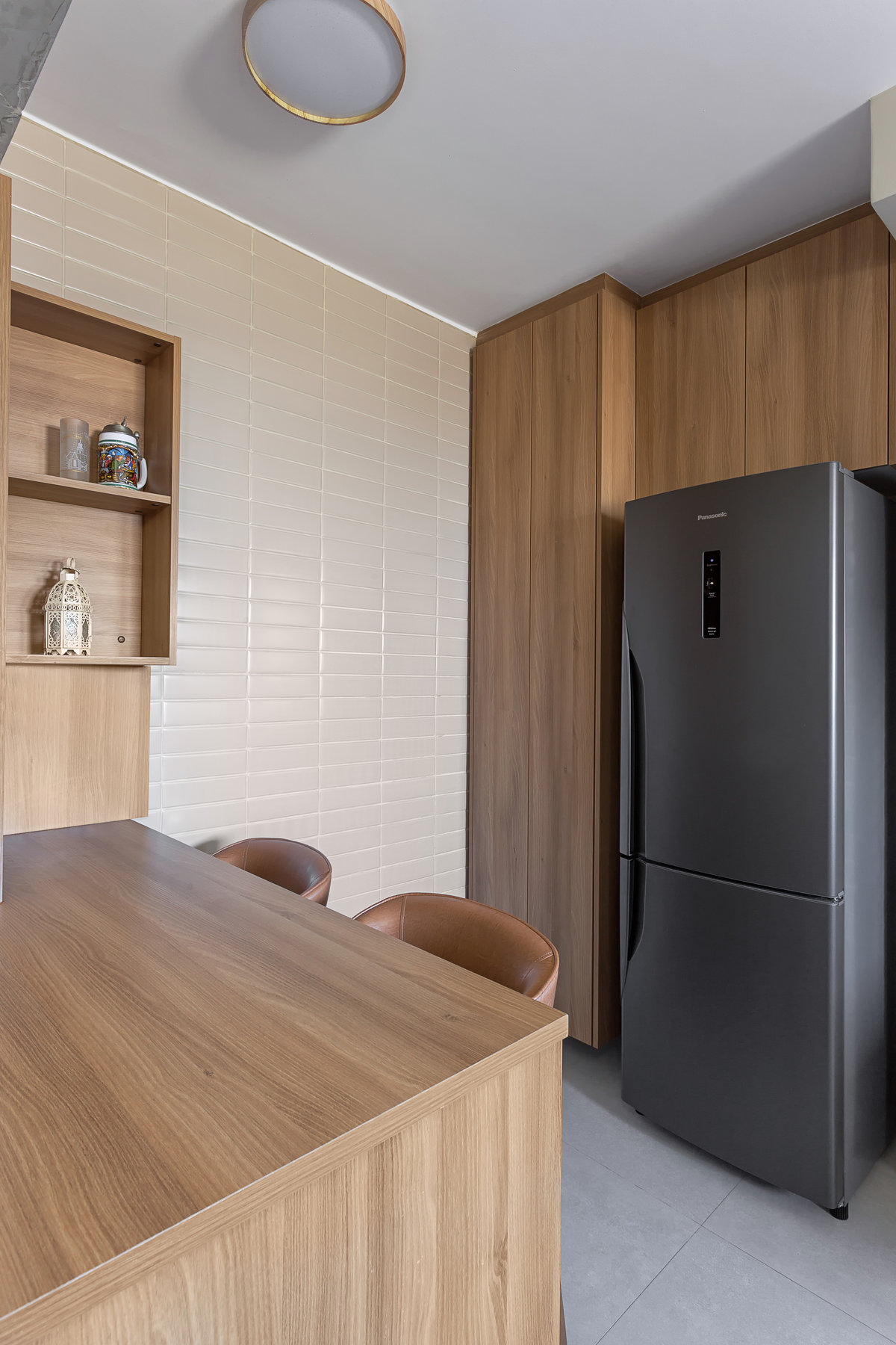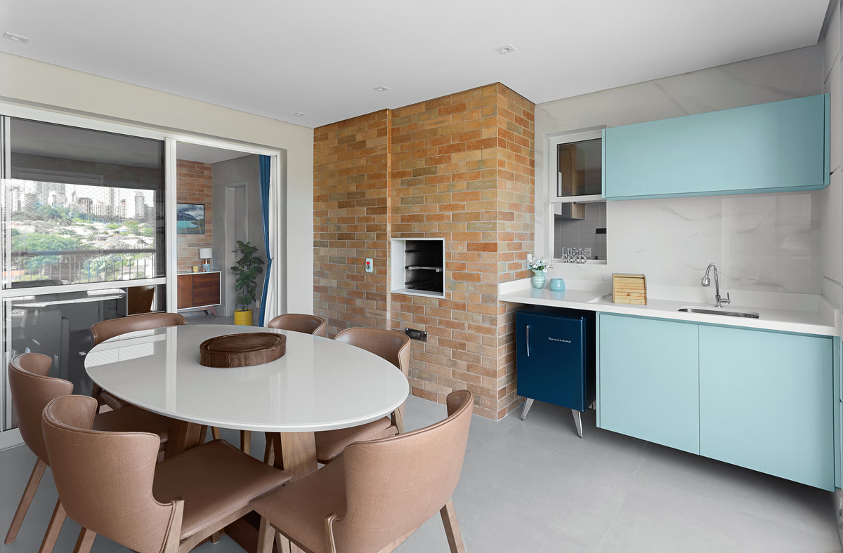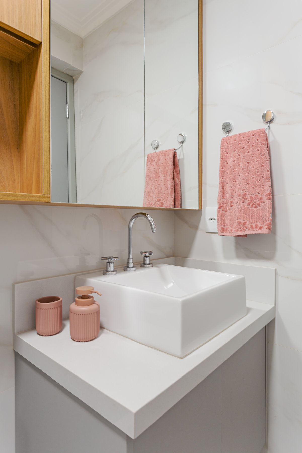 O lavabo ganhou cor nas paredes, um novo espelho orgânico, iluminação decorativa e toques de madeira, mantendo a bancada original. A cozinha foi renovada com novos revestimentos, iluminação e um armário para o micro-ondas. A varanda gourmet também recebeu tijolinhos e uma mesa oval para melhor acomodar visitas. A antiga sala de TV foi convertida em um versátil quarto de hóspedes e home office, graças à construção de uma parede de drywall.