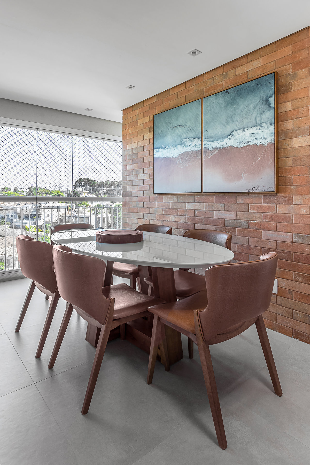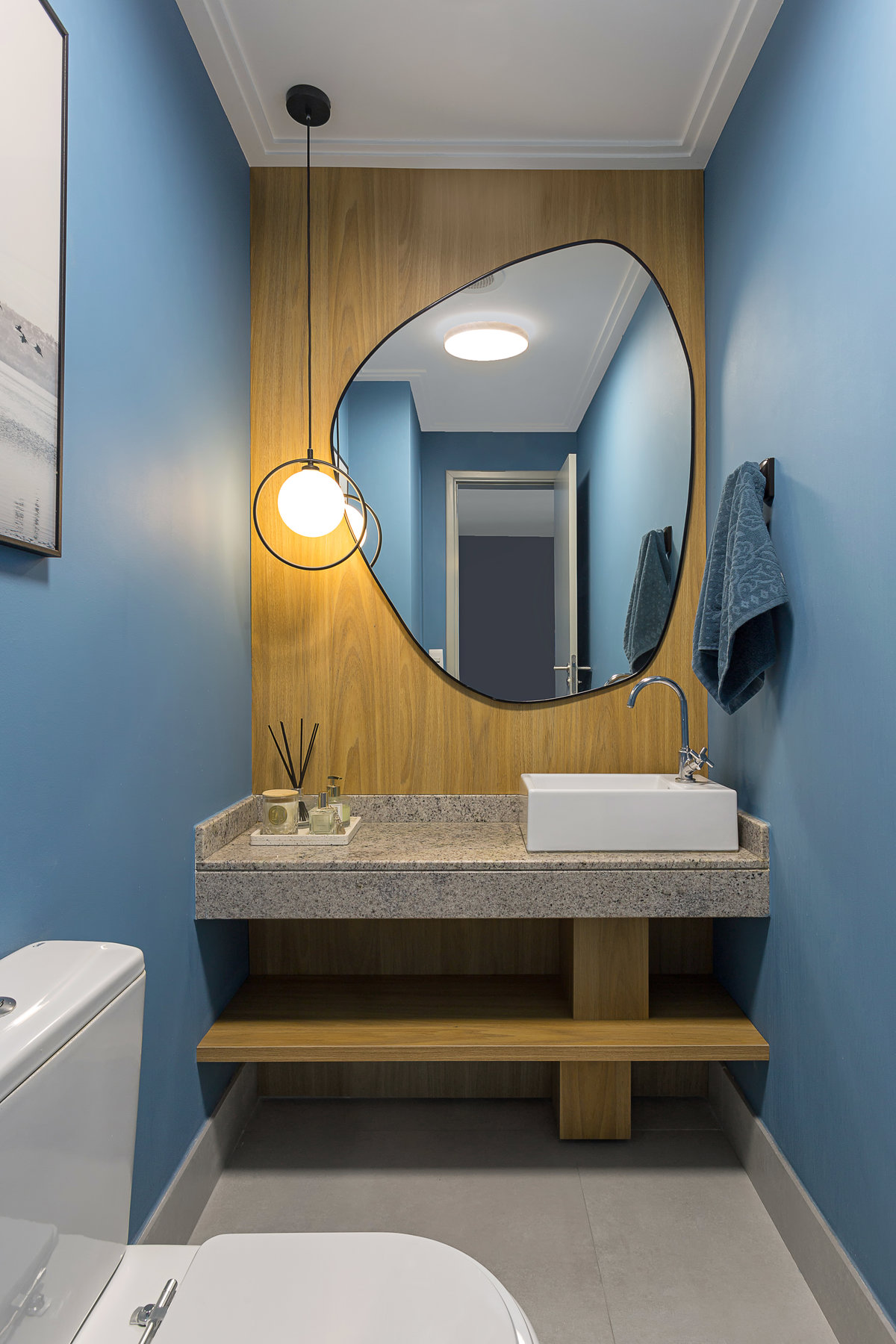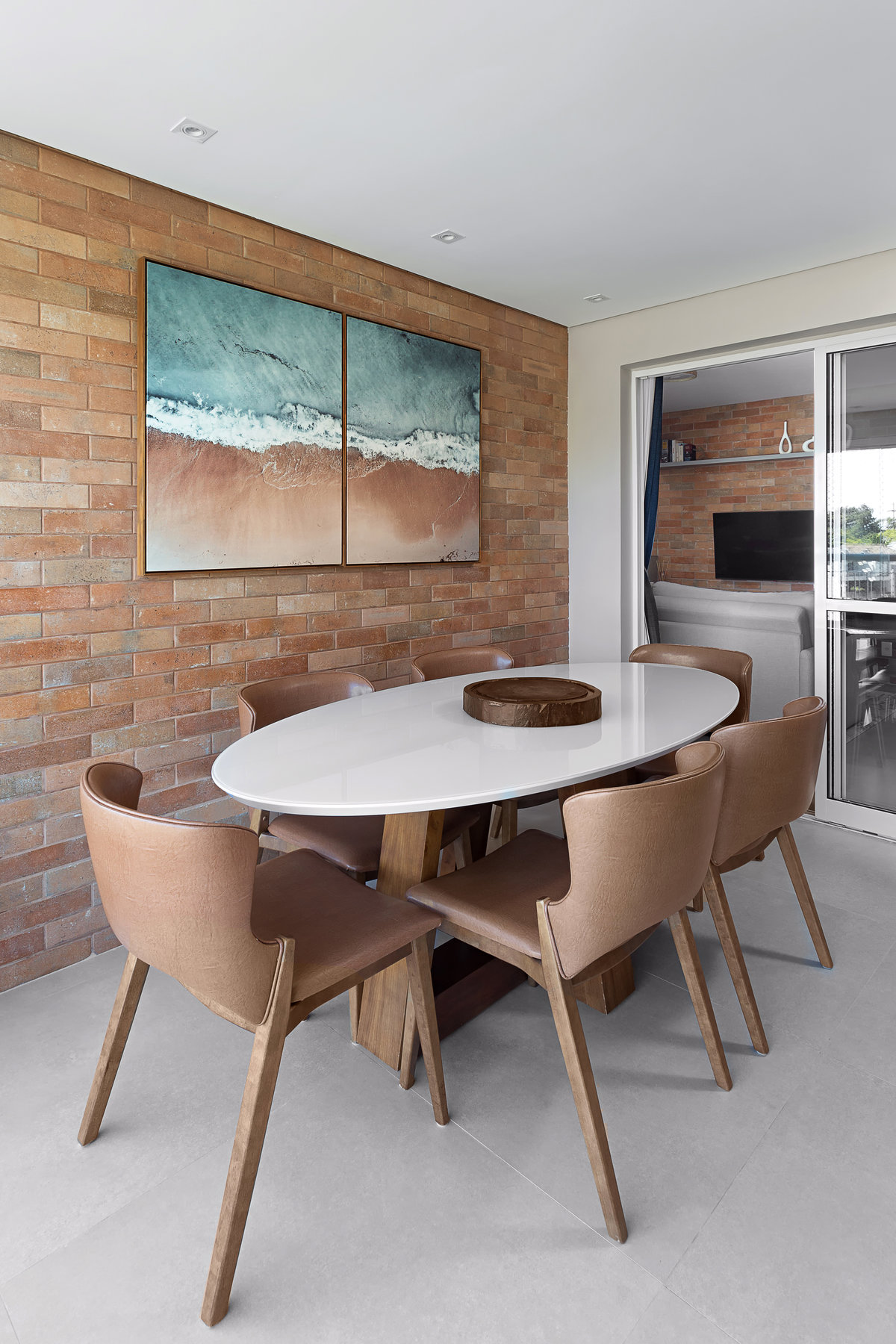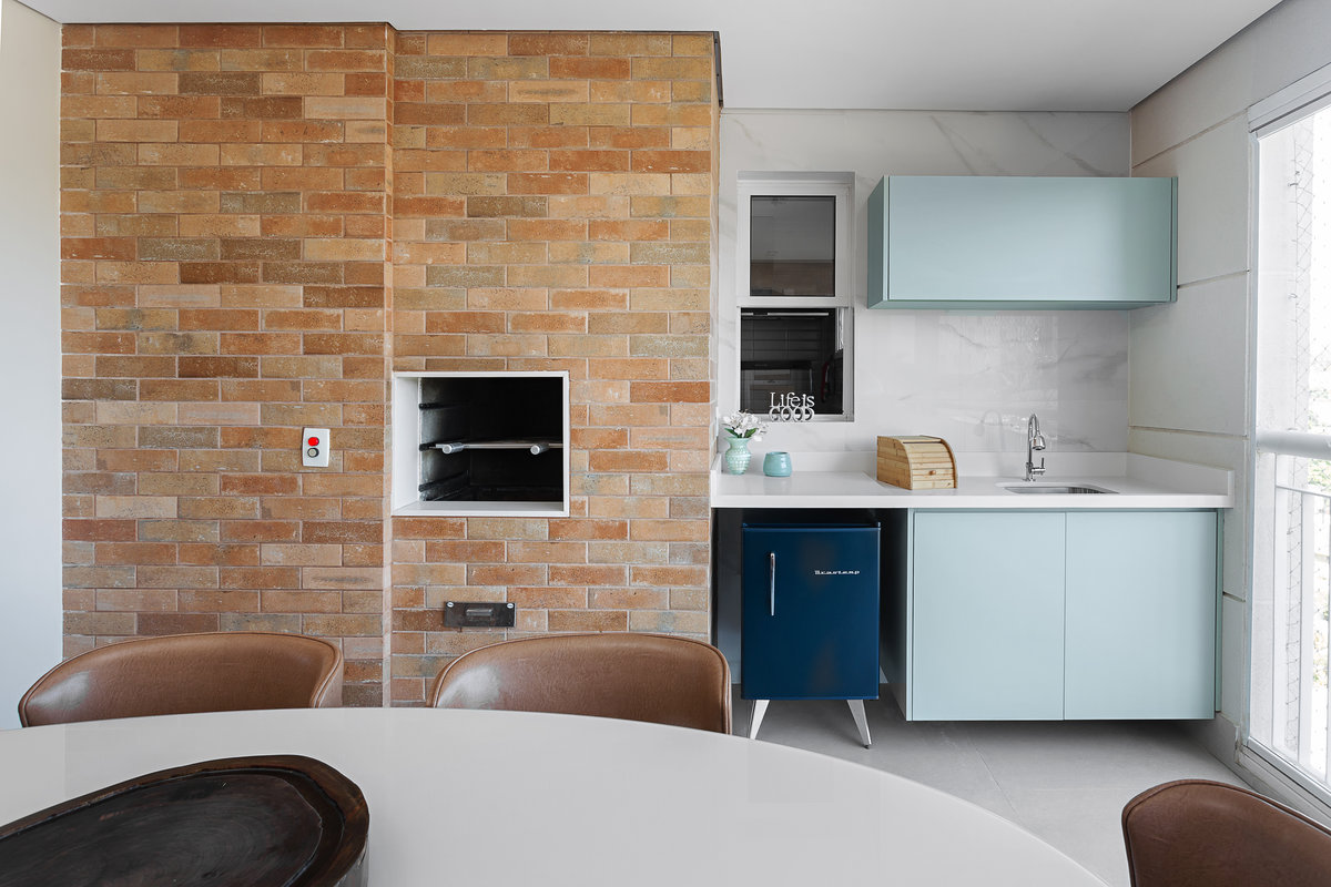 O lavabo ganhou cor nas paredes, um novo espelho orgânico, iluminação decorativa e toques de madeira, mantendo a bancada original. A cozinha foi renovada com novos revestimentos, iluminação e um armário para o micro-ondas. A varanda gourmet também recebeu tijolinhos e uma mesa oval para melhor acomodar visitas. A antiga sala de TV foi convertida em um versátil quarto de hóspedes e home office, graças à construção de uma parede de drywall.