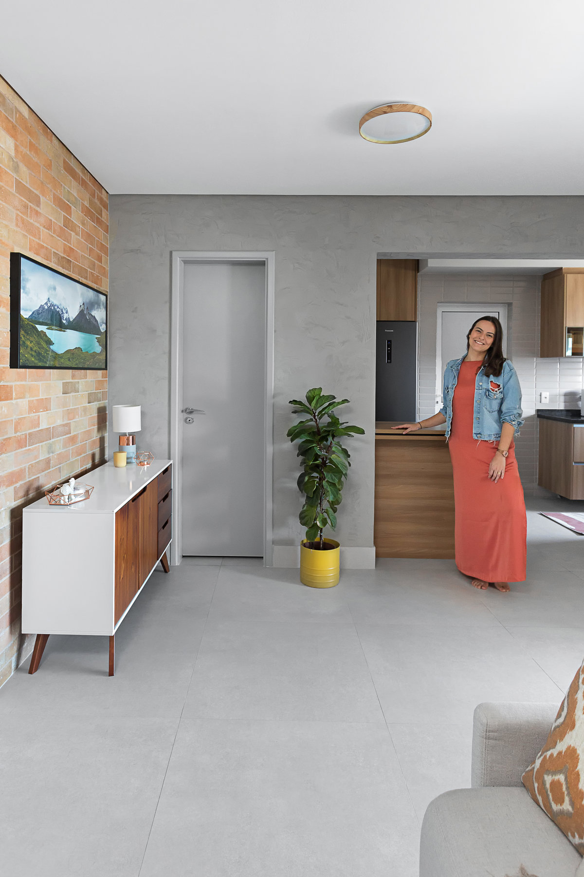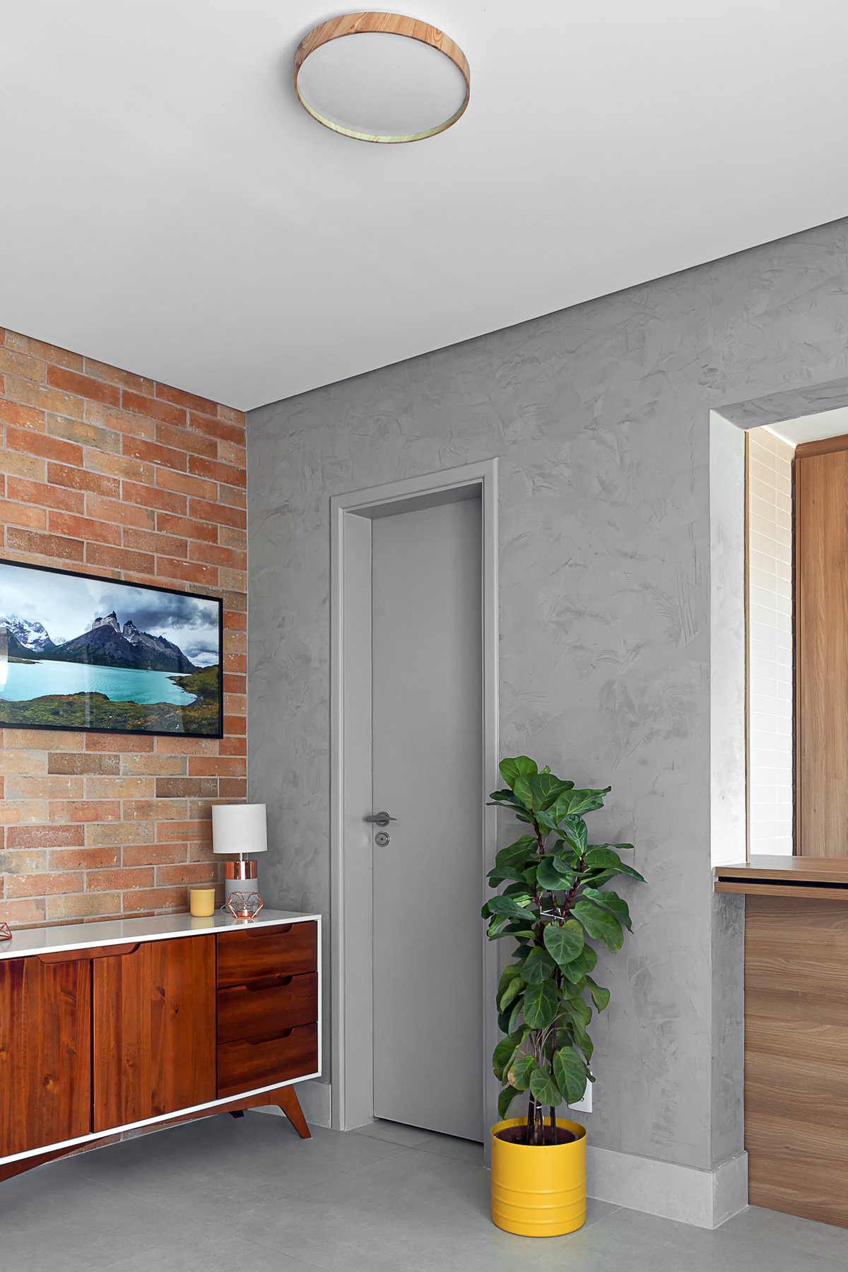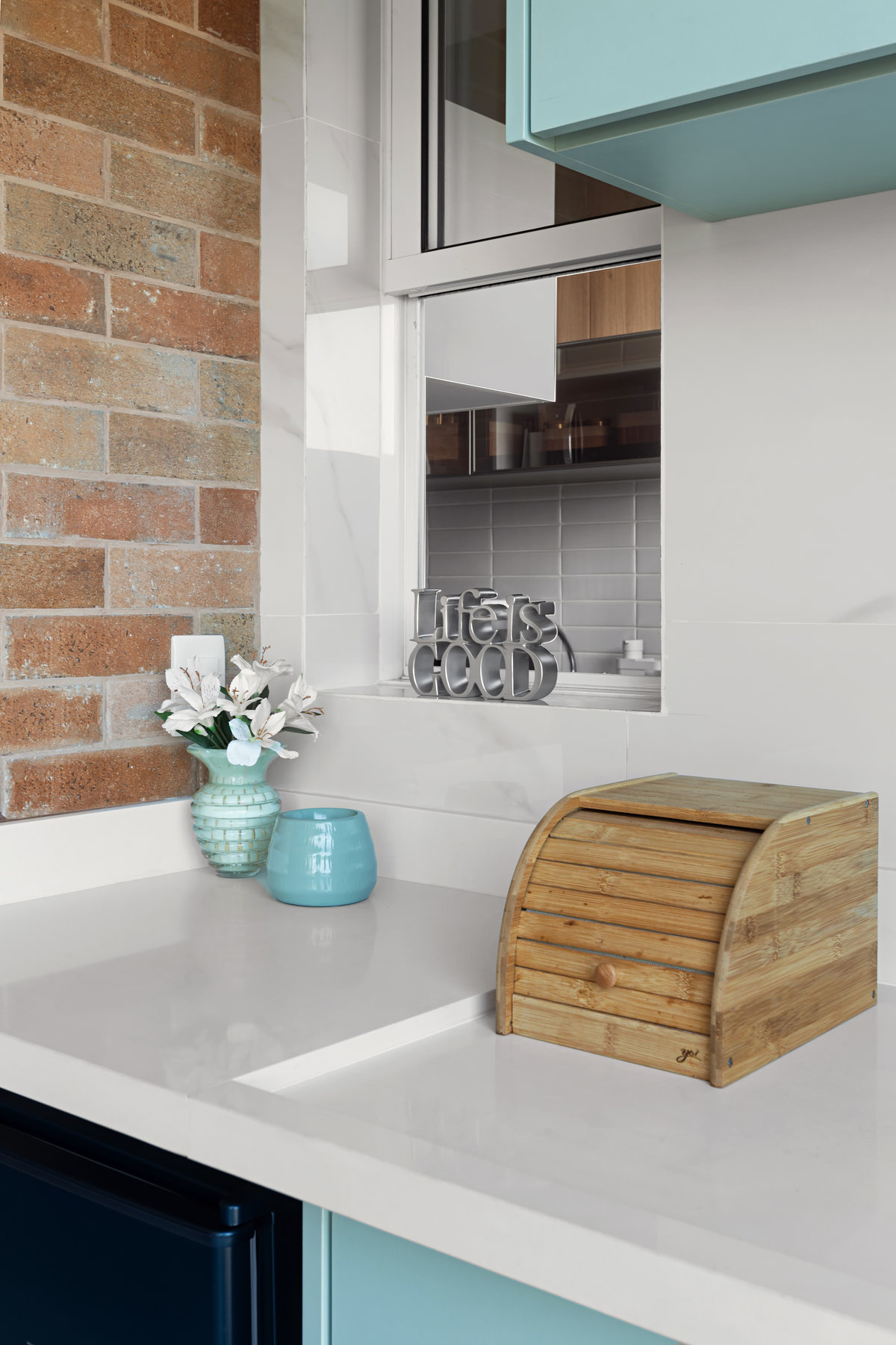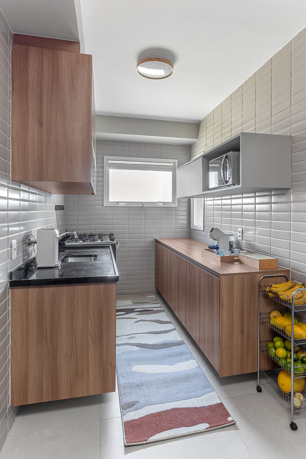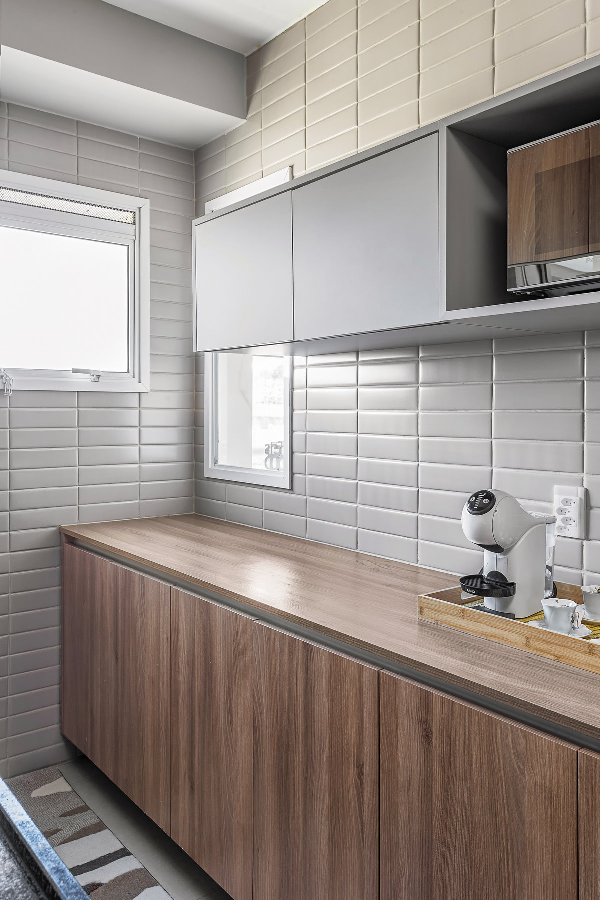 O lavabo ganhou cor nas paredes, um novo espelho orgânico, iluminação decorativa e toques de madeira, mantendo a bancada original. A cozinha foi renovada com novos revestimentos, iluminação e um armário para o micro-ondas. A varanda gourmet também recebeu tijolinhos e uma mesa oval para melhor acomodar visitas. A antiga sala de TV foi convertida em um versátil quarto de hóspedes e home office, graças à construção de uma parede de drywall.