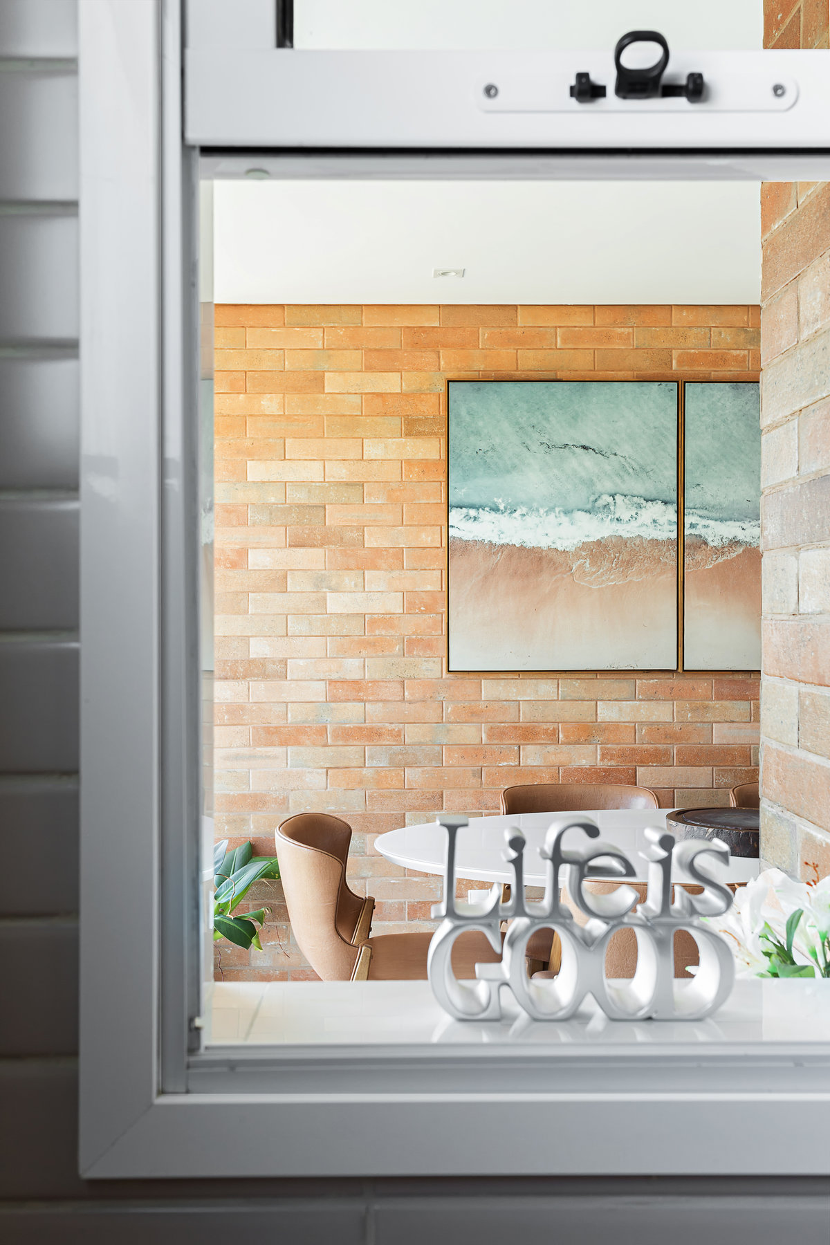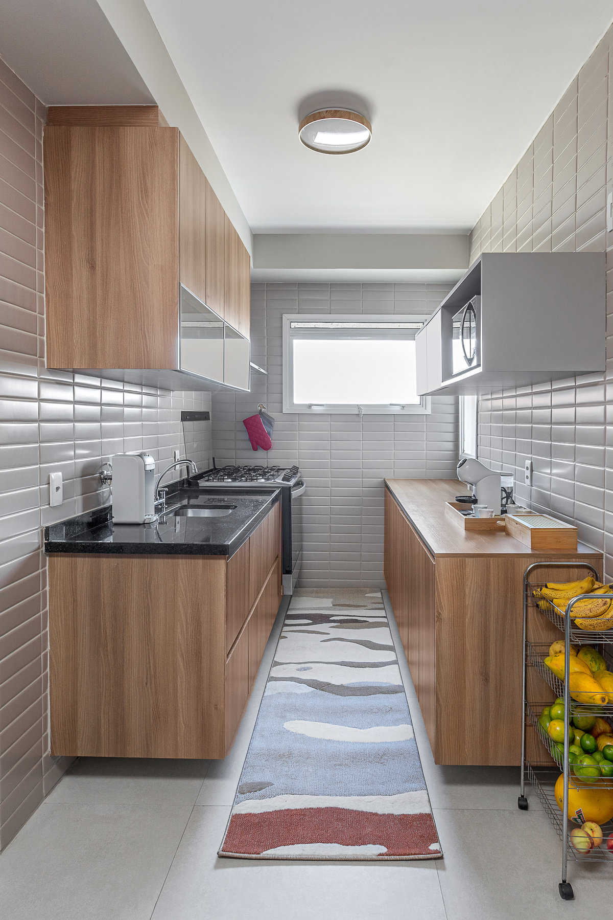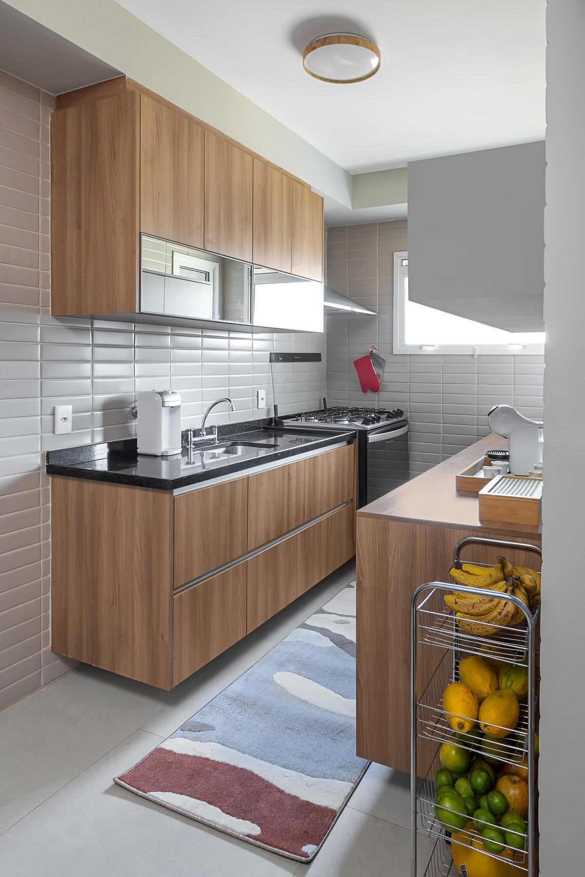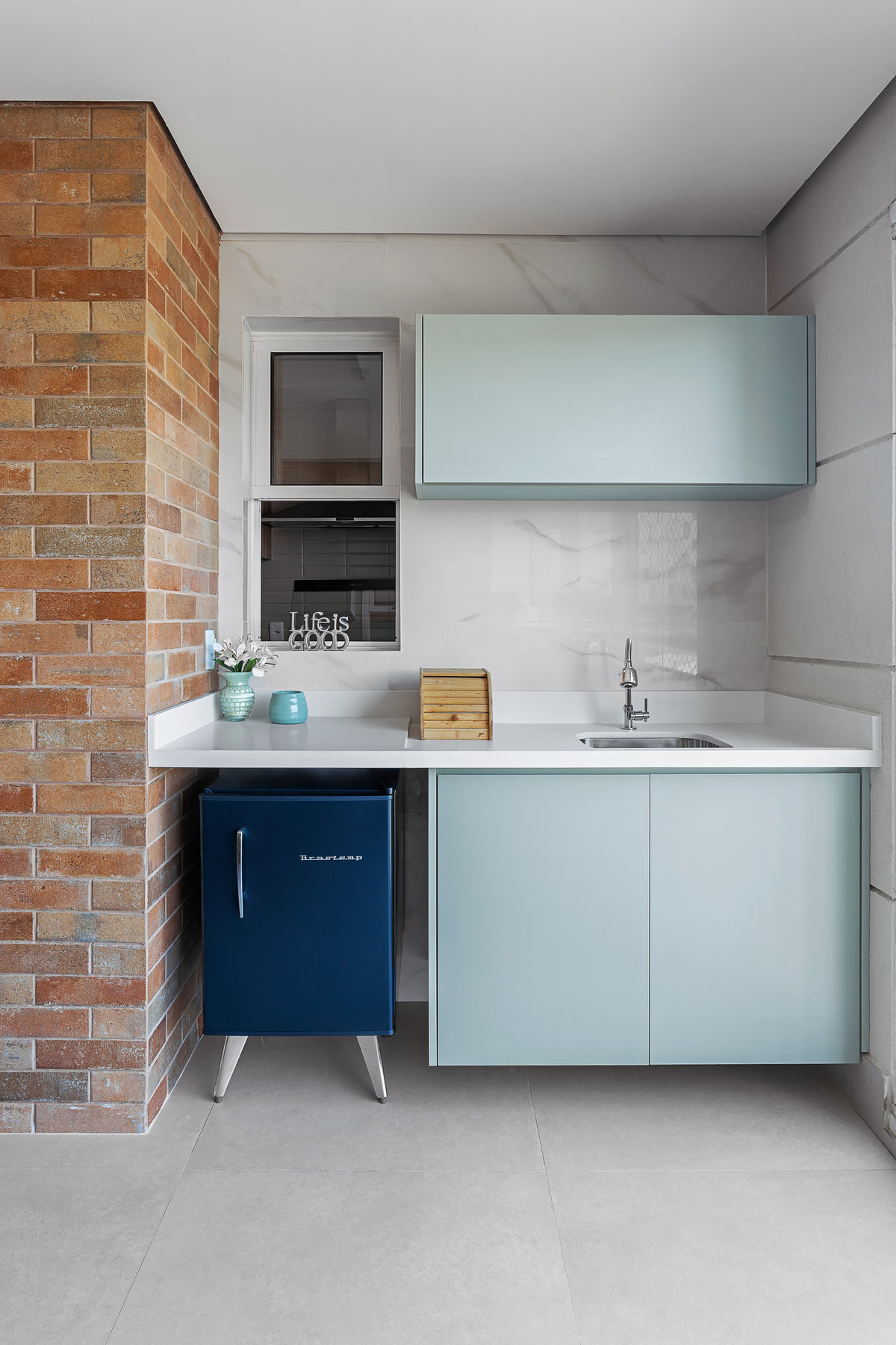 O lavabo ganhou cor nas paredes, um novo espelho orgânico, iluminação decorativa e toques de madeira, mantendo a bancada original. A cozinha foi renovada com novos revestimentos, iluminação e um armário para o micro-ondas. A varanda gourmet também recebeu tijolinhos e uma mesa oval para melhor acomodar visitas. A antiga sala de TV foi convertida em um versátil quarto de hóspedes e home office, graças à construção de uma parede de drywall.