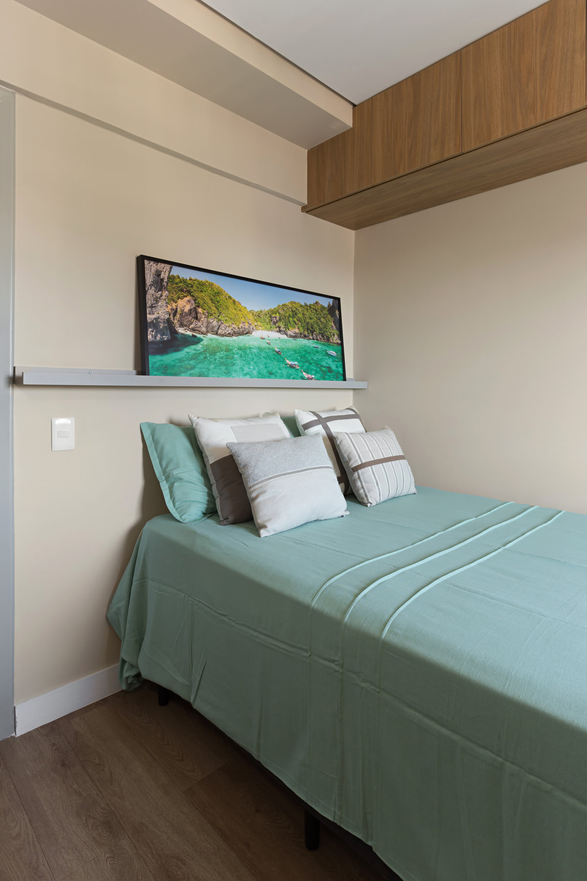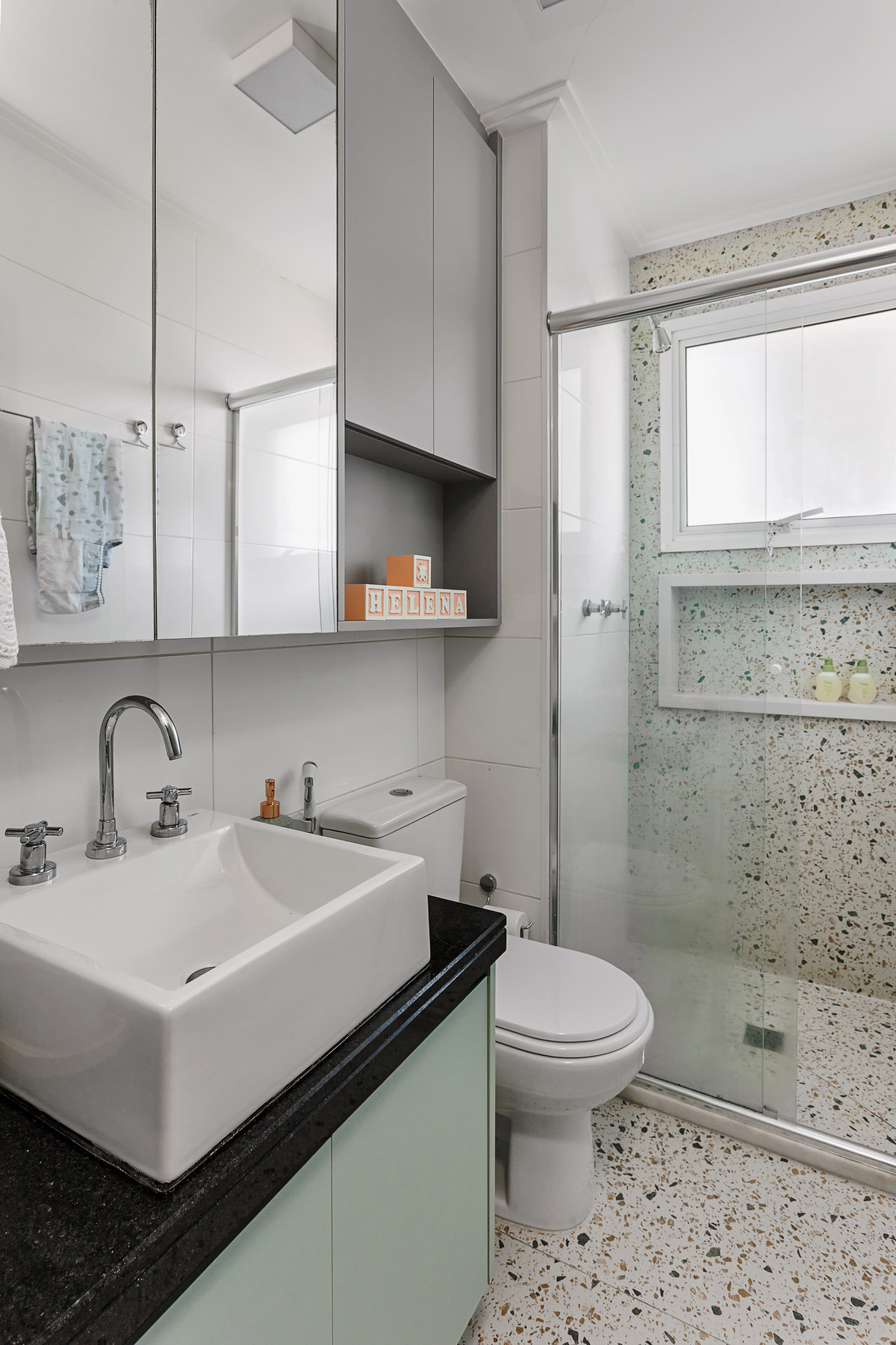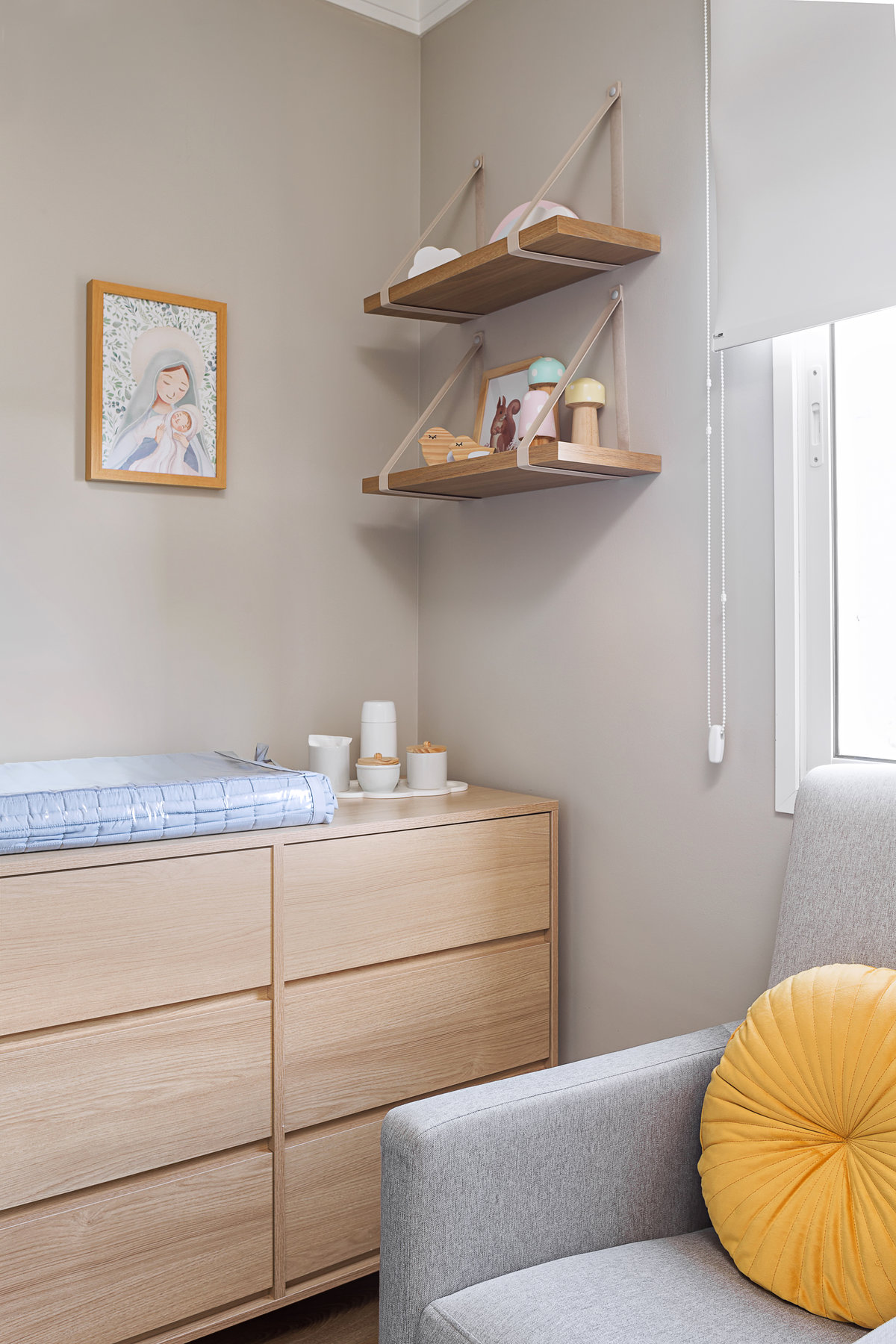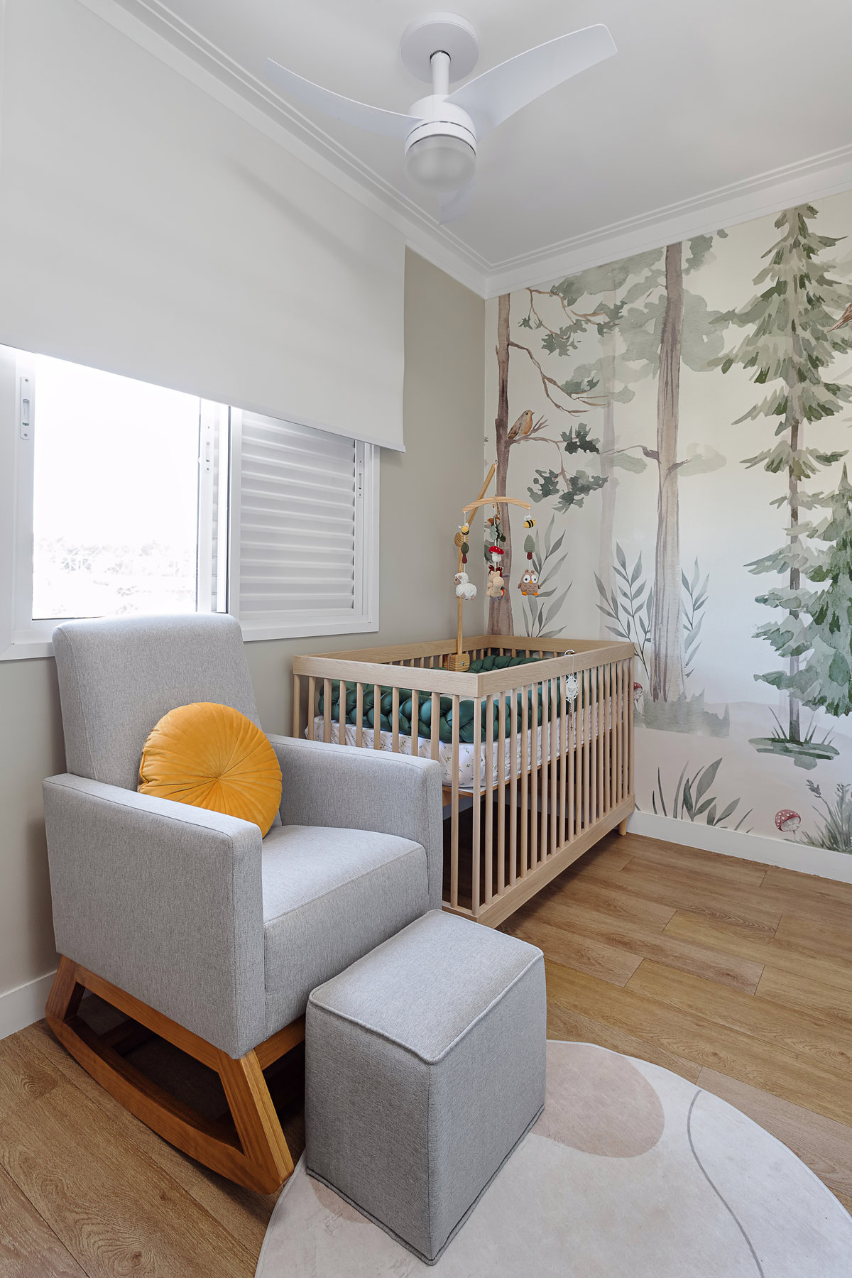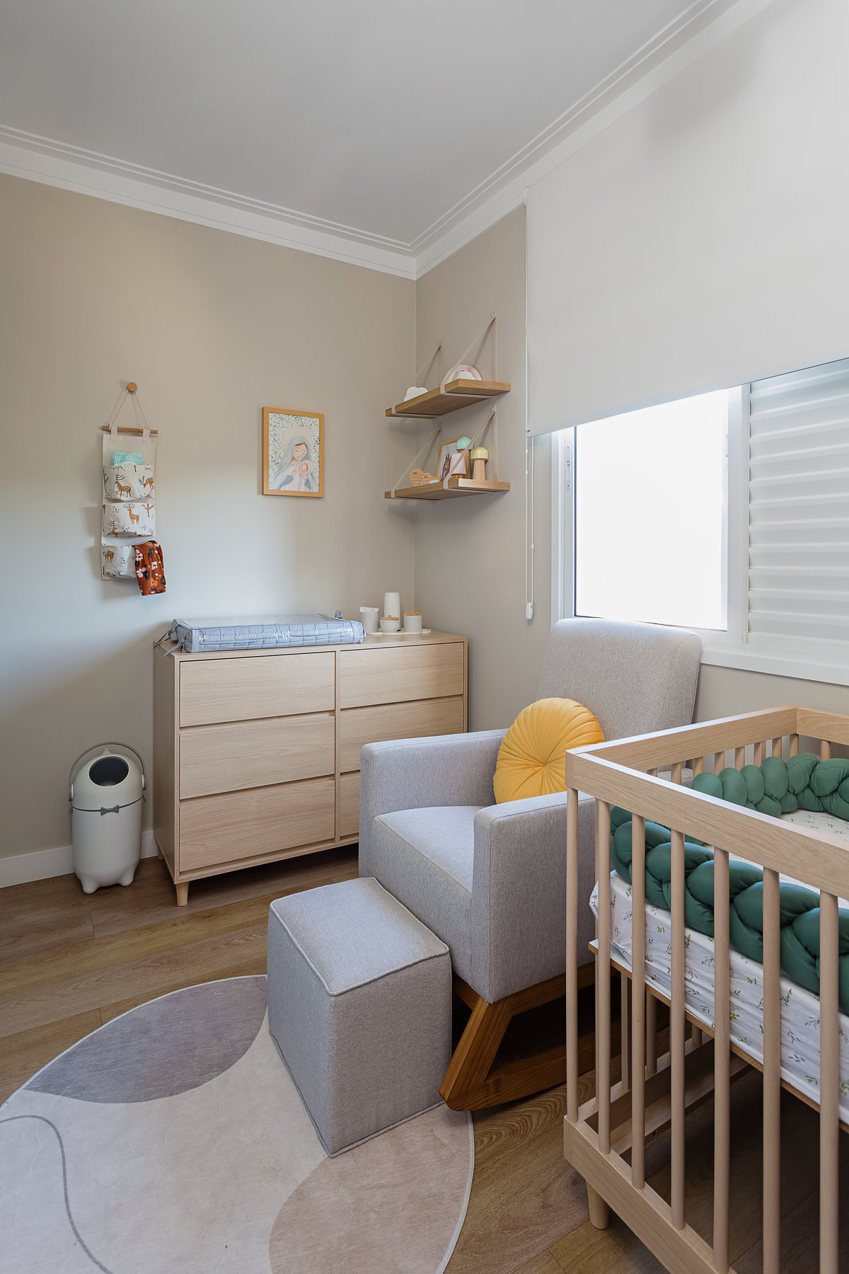 A suíte master foi revitalizada com novas cores, marcenaria personalizada e uma decoração aconchegante, transformando o espaço em um verdadeiro refúgio. O banheiro da suíte ganhou um toque de sofisticação com revestimento marmorizado e um armário em madeira com espelho, mantendo a funcionalidade e a elegância. Por fim, uma suíte neutra e serena foi projetada com móveis em madeira, decoração delicada, um papel de parede inspirado na natureza, revestimento granilite no banheiro e o tom de verde no armário, pensando em receber bebê no futuro. Dois anos depois, esse espaço acolheu com carinho a nova integrante da família, Helena.