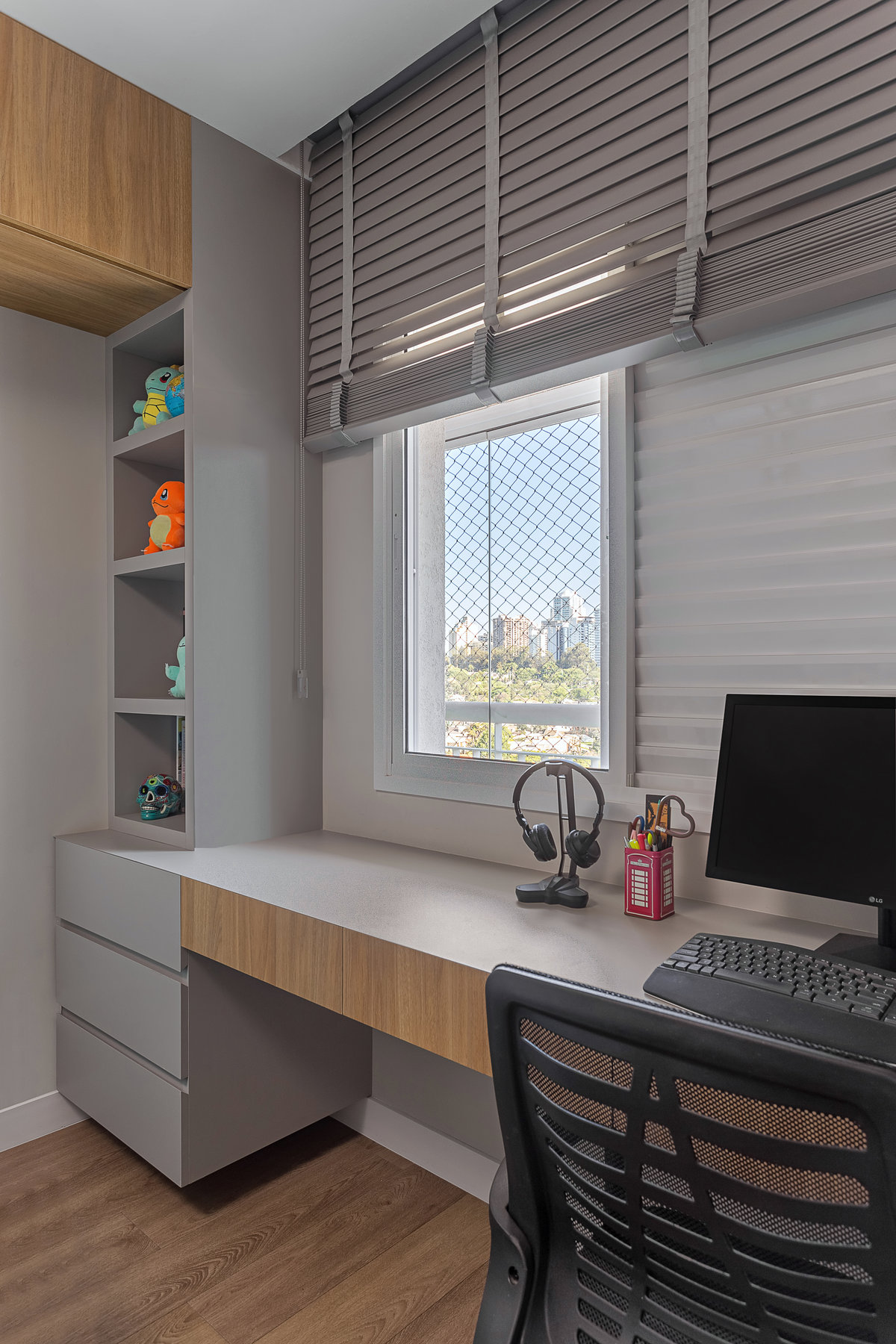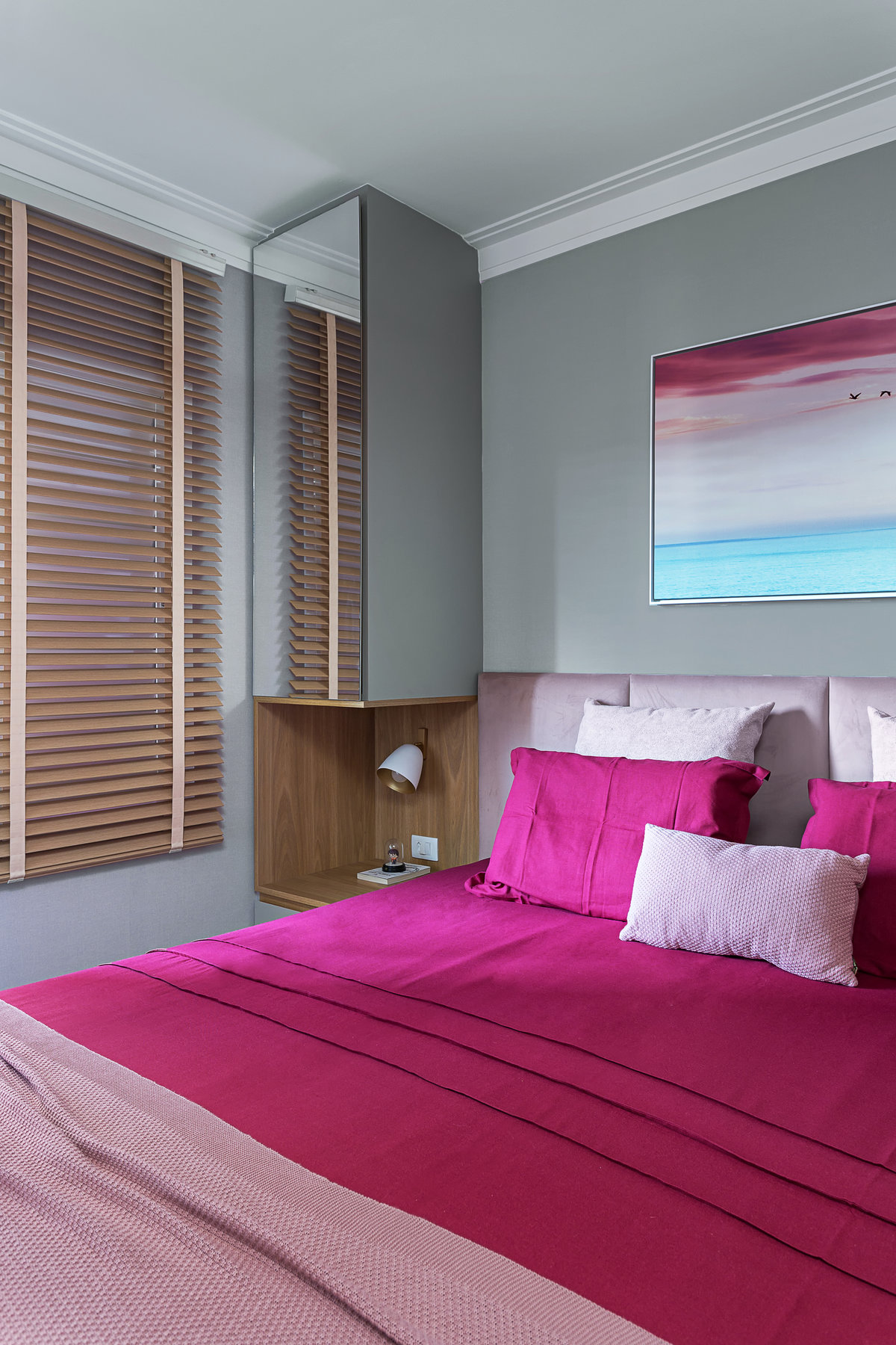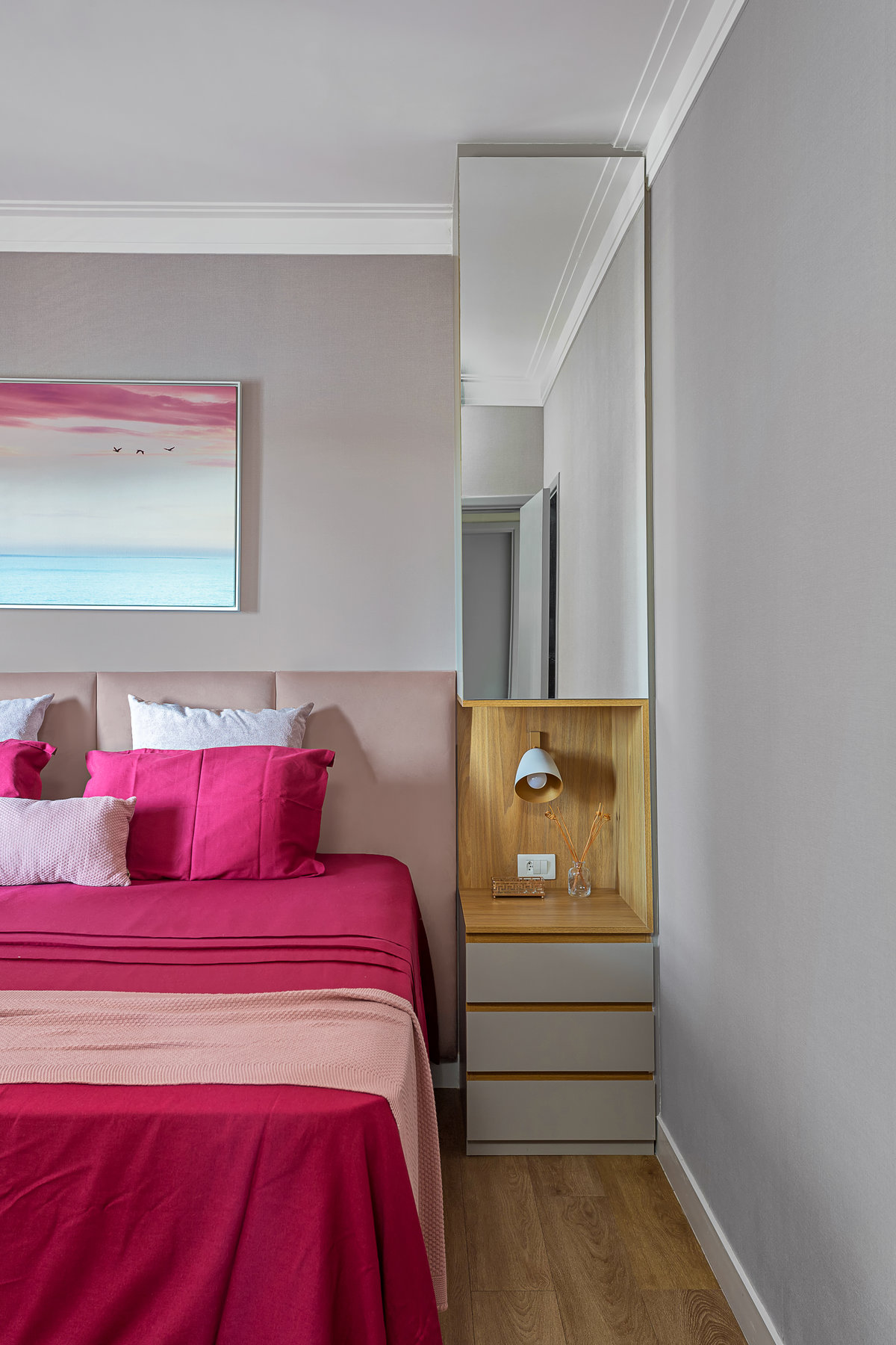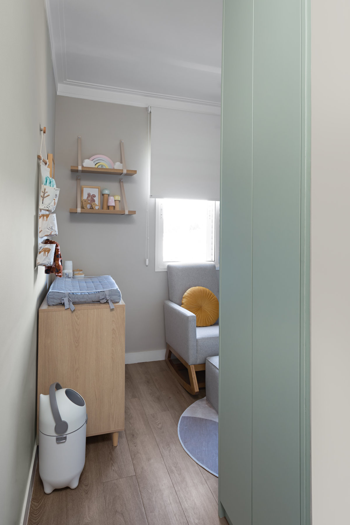 A suíte master foi revitalizada com novas cores, marcenaria personalizada e uma decoração aconchegante, transformando o espaço em um verdadeiro refúgio. O banheiro da suíte ganhou um toque de sofisticação com revestimento marmorizado e um armário em madeira com espelho, mantendo a funcionalidade e a elegância. Por fim, uma suíte neutra e serena foi projetada com móveis em madeira, decoração delicada, um papel de parede inspirado na natureza, revestimento granilite no banheiro e o tom de verde no armário, pensando em receber bebê no futuro. Dois anos depois, esse espaço acolheu com carinho a nova integrante da família, Helena.
